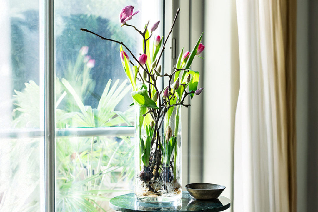 Am Samstag, 17. Januar, ist Tulpenpflücktag, und du kannst bei uns dieses Blumenarrangement in einer hohen Vase erstellen. Um einen Zweig des „Tulpenbaums“ Magnolie arrangierst du Hyazinthen und Tulpen mit Knolle. Dauer: ca. 20 Minuten. Kosten: € 23.- pro Person, inklusive aller Materialien.